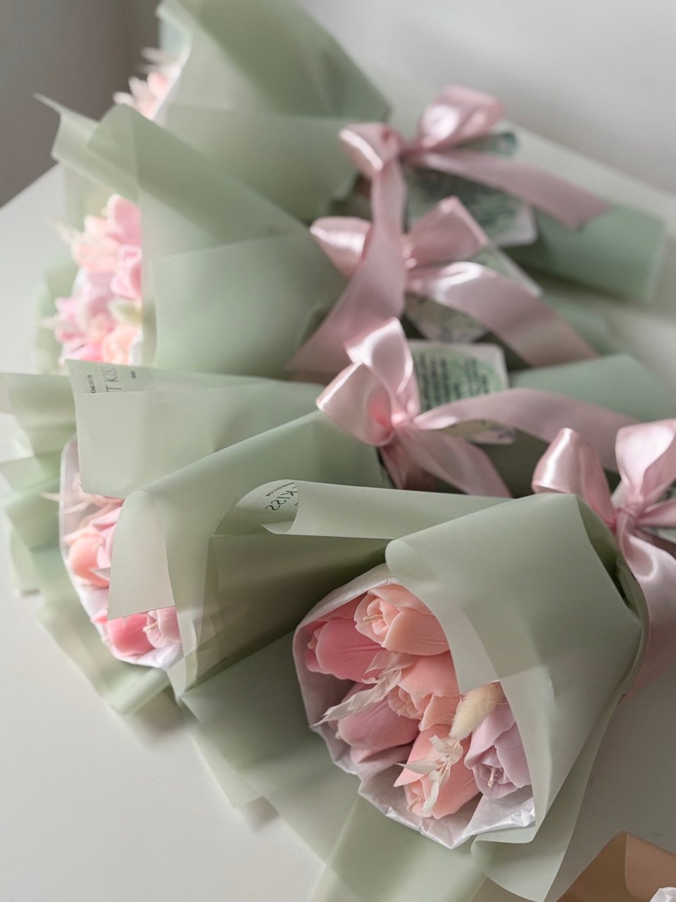 Bukiet delikatnoróżowych tulipanów – świece sojowe na Dzień Kobiet to ręcznie stworzona kompozycja, która łączy subtelność kwiatów z naturalnym urokiem świec sojowych. Siedem tulipanów w pastelowym odcieniu różu zostało starannie wykonanych z wysokiej jakości wosku sojowego i ozdobionych delikatnymi akcentami dekoracyjnymi oraz naturalnym suszem. Całość owinięta jest w elegancki biało–turkusowy papier, tworząc stylowy i wyjątkowy prezent na 8 marca.