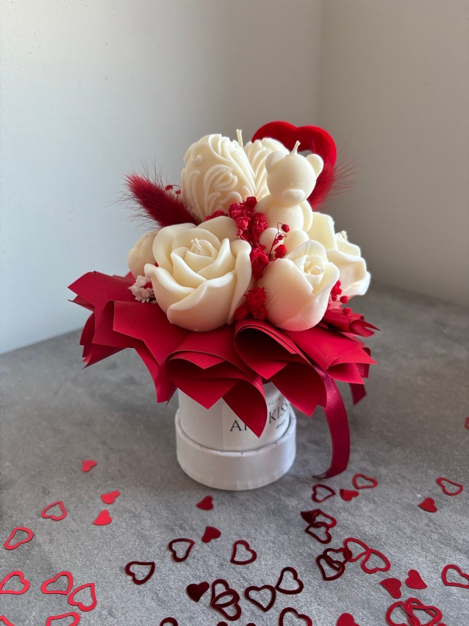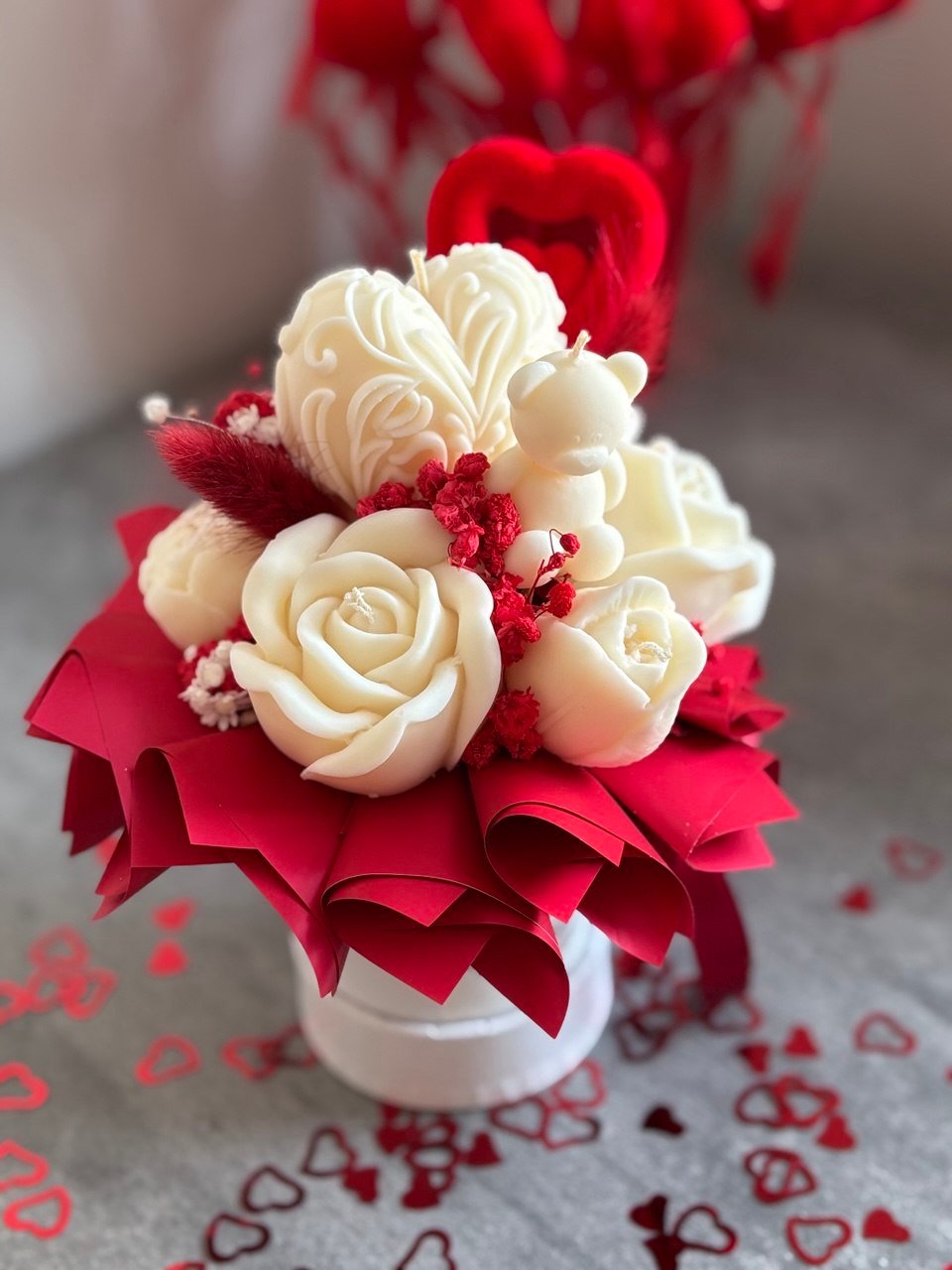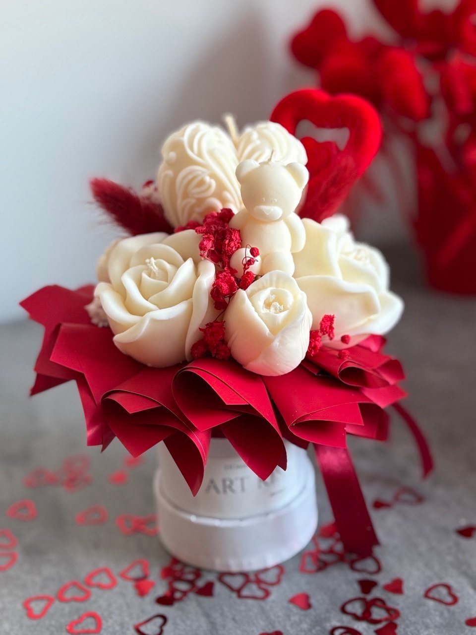 Walentynkowy flower box ze świec sojowych to wyjątkowa, romantyczna kompozycja stworzona z myślą o najpiękniejszych emocjach. Naturalne świece sojowe w połączeniu z kwiatami tworzą elegancki element dekoracyjny, który wprowadza ciepłą i przytulną atmosferę do każdego wnętrza. To idealny sposób, aby wyrazić miłość i bliskość w subtelny, stylowy sposób.