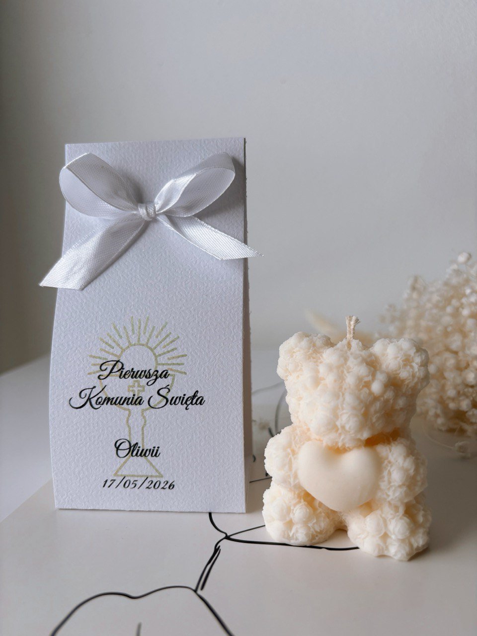 Wyjątkowe podziękowanie dla Gości w formie ręcznie wykonanej świeczki sojowej to piękna i symboliczna pamiątka ważnego dnia. Naturalna świeca w kształcie uroczego misia z serduszkiem zachwyca delikatnym wyglądem i subtelną kolorystyką, idealnie wpisując się w klimat uroczystości komunijnych, chrztu czy innych rodzinnych wydarzeń.
